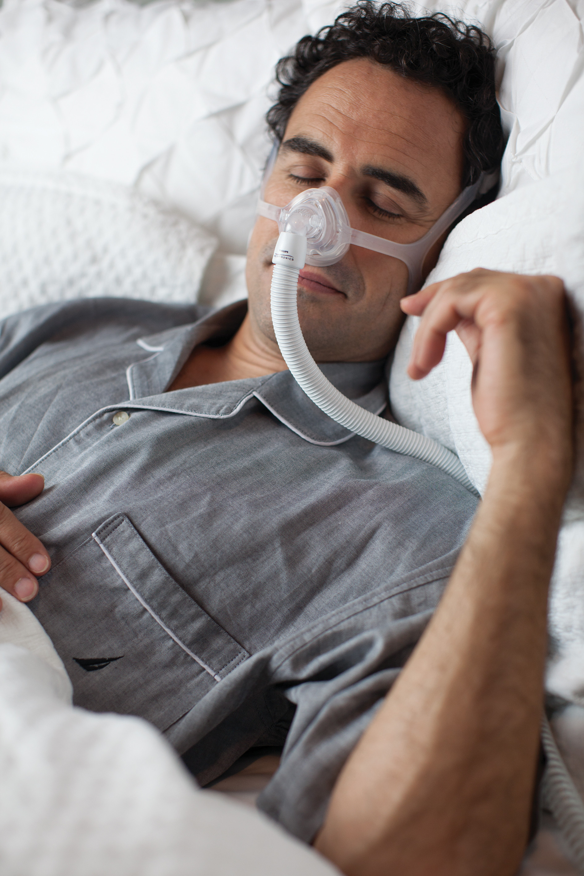 CPAP療法(持続陽圧呼吸療法)とは、で圧力をかけた空気を鼻からに送り込み、気道(空気の通り道)を広げて、睡眠中に呼吸が止まらないようにする治療法です。CPAPは、CPAP機器本体、空気を送るチューブ、鼻に当てるマスクからなり、睡眠中